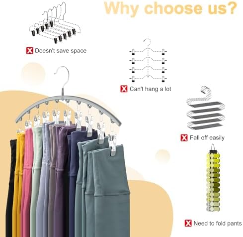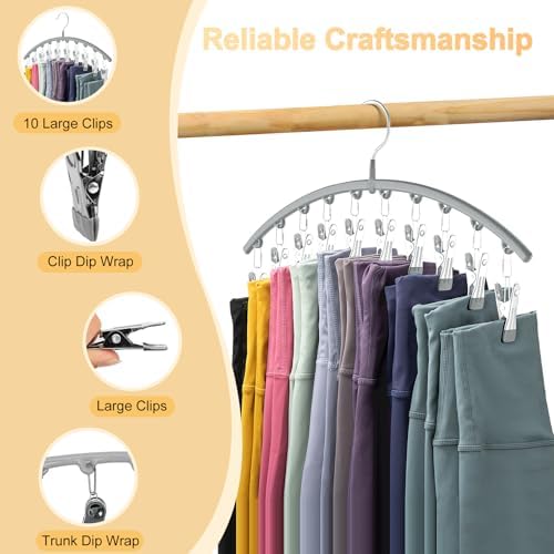 Maximize Closet Space: Our Premium Legging Organizer Hangers are designed to optimize your closet space; they include two-pack hangers; each hanger comes with ten large clips, allowing you to store up to 20 pairs of leggings per hanger, keeping your wardrobe neat and organized. Easy To Use: Wardrobe clothes organizer hangers do not need to fold and roll up the trousers. Just clip them directly. The leggings organizer for the closet with clips is integrated and can be hung now in the closet as soon as you open the package. You can hang them on the wall, closet, door, and anywhere you want. Versatile & Multi-functional: Not just for leggings, our hangers are perfect for organizing yoga pants, yoga leggings, jeans, shorts, slacks, skirts, underwear, sportswear, T-shirts, and other accessories, making it an essential closet organization tool for any fashion enthusiast. Durable & Sturdy Design: Made from high-quality, heavy-duty carbon steel, our legging hangers are built to last, ensuring your clothes remain securely in place and neatly organized. The clips and the trunk part adopt the dipping plastic protection, which doesn't hurt the pants, and leaves no traces. Satisfaction Guaranteed: The legging storage hangers for clothes allow easy access to clothing and storage, making it a breeze to sort through your leggings and find the perfect pair for your outfit. These dorm room essentials are a fantastic present for your friends, family, neighbors, and colleagues.