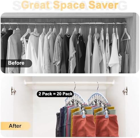 【10 Pcs Large Capacity】A set of 1 easily accommodates 10 pairs of yoga pants. A huge storage capacity can meet all your storage needs. Each yoga pants hanger comes with 10 large clips, which can save you valuable time and make it easier to put up/hang up the pants you need. 【Pants Hangers Space Saving】No assembly is required. Leggings organizer for closet with clips is integrated and can be hung directly in the closet as soon as you open the package. You can hang them on the wall, closet, door, and everywhere you want. No need to take up any additional space, which is convenient to use daily. 【Easy to Use & Wide Uses】Wardrobe clothes organizer hangers do not need to fold and roll up the trousers. Just clip them directly. The clip hangers for pants are great for storage yoga pants, jeans, yoga leggings, shorts, slacks, skirts, underwear, sportswear, T-shirts, ties, bras, and more. 【Hold Tight But No Traces】The skirt hangers for women for clothes are mainly made of high-quality carbon steel. The surface is electroplated, has an excellent load-bearing capacity, and is durable and practical. The clips and the trunk part adopt the dipping plastic protection, with the smooth and widened rubber-coated edge for the clips reducing the friction with leggings, and leaving no traces. 【Perfect Present】The yoga pants hangers with clips are suitable as a fantastic present for your friends, family, neighbors, and colleagues. The closet organization allows them to declutter the closet neatly and easily, and find and choose accessories when getting ready.